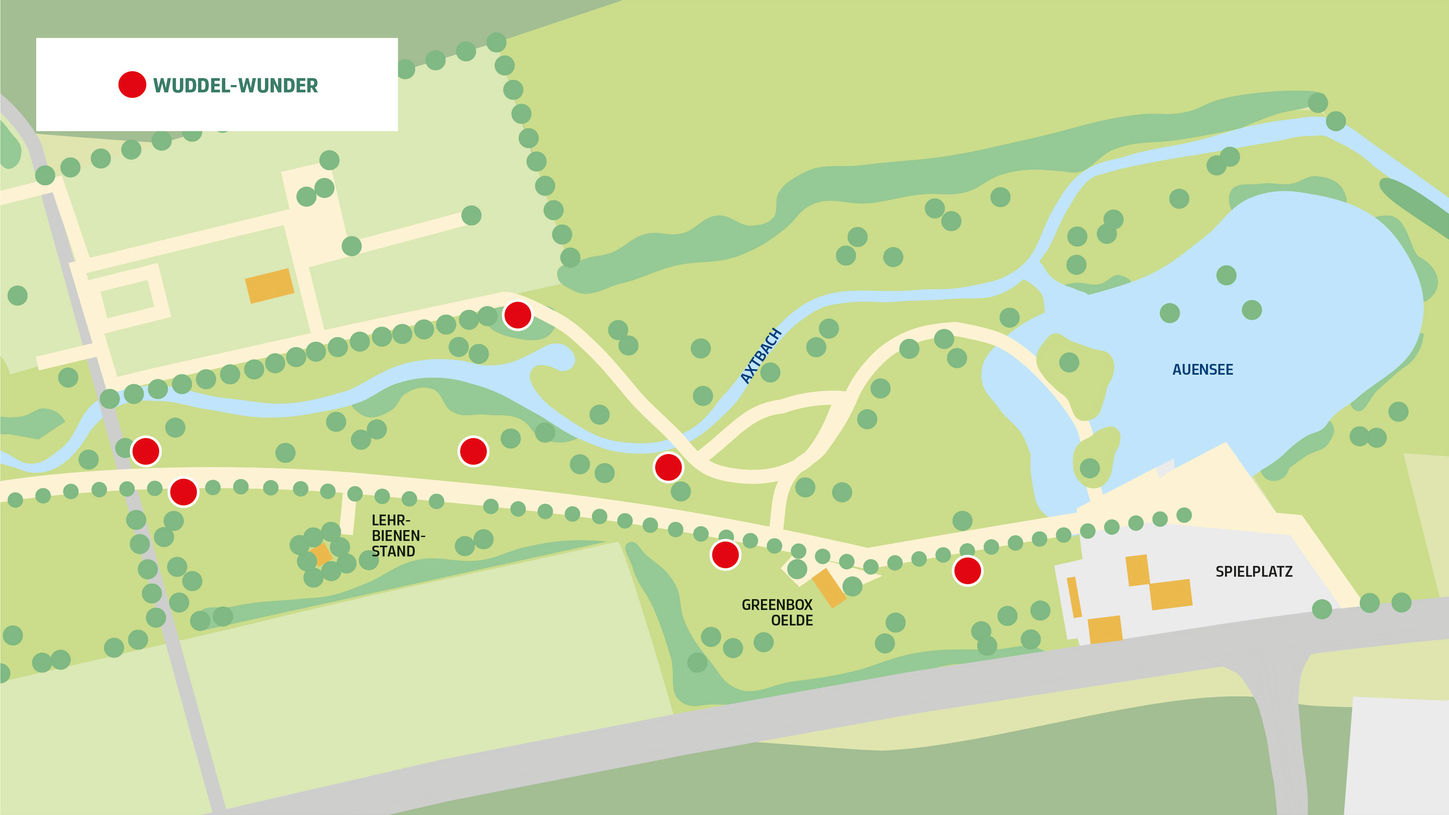 Spazierengehen, etwas über Natur lernen – nicht gerade das, wo Kinder begeistert Juhu rufen. Wir hoffen, dass wir mit dieser Wuddel Tour doch ein bisschen Lust darauf machen. Dafür haben wir die Inhalte kindgerecht und spielerisch aufbereitet. Zu sehen im Vier-Jahreszeiten-Park Oelde, initiiert von der Jägerschaft, dem Hegering Oelde.